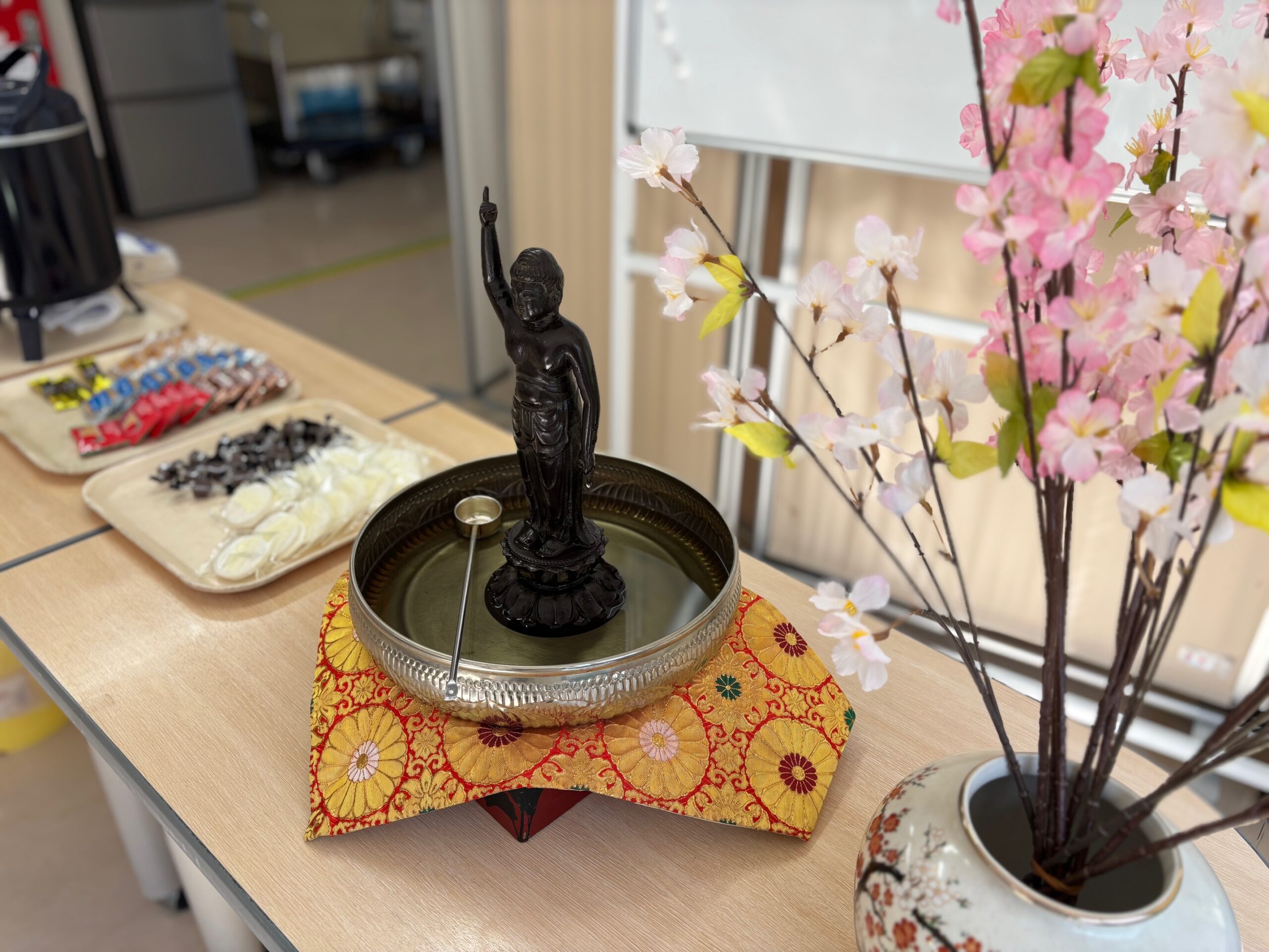 会場では花まつりも同時開催されており、ガーランド作成が終わった患者様からお釈迦様に甘茶を注ぎ、コーヒーや甘茶・お菓子を楽しまれました🍵🍪